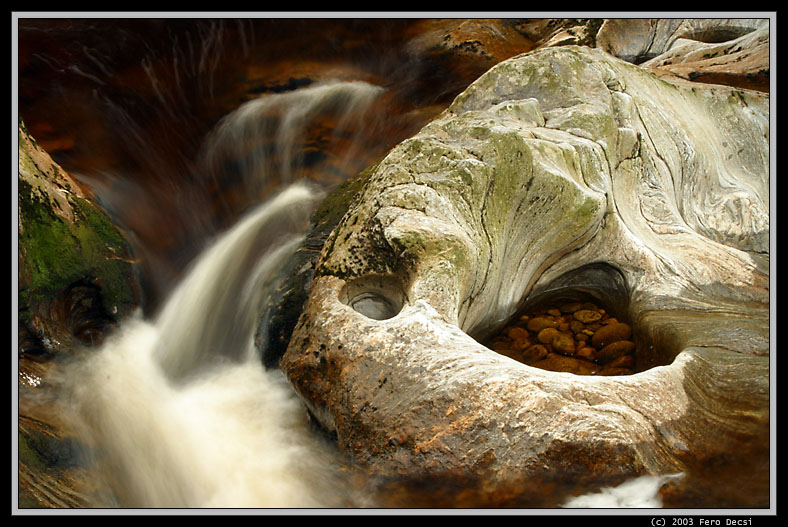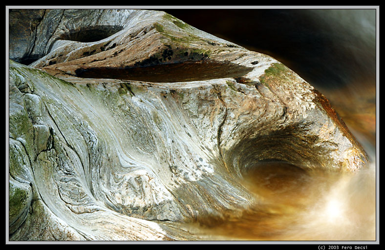 Prúdenie vody počas tísícov rokov neustálym pôsobením vymieľa v skale takzvané hrnce. Túto činnosť vody nazývajú